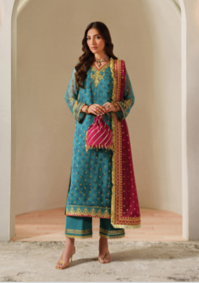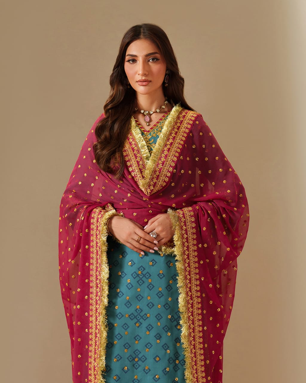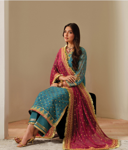 A zinc ensemble featuring a fully embroidered shirt with contrasting threadwork and detailing. Paired with wide-legged trouser with detailed border and a printed deep maroon chiffon dupatta adorned with accents. Ideal for festive occasions, this ensemble radiates sophistication.